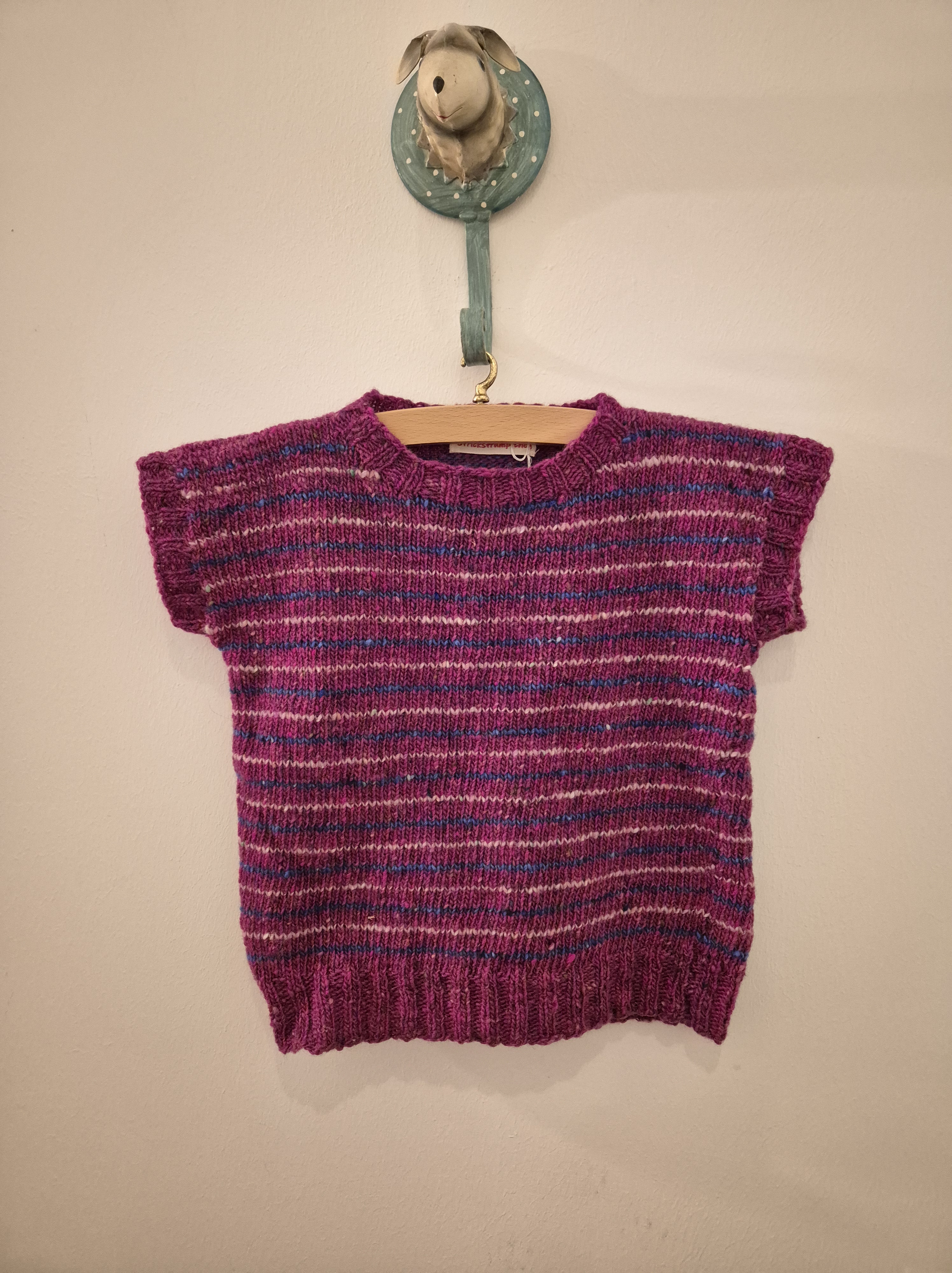 Pullunder aus Donegal-Merinotweed in lila mit Streifen blau und natur für Babys im Alter von ca. 12 bis 18 Monaten.